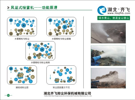 除尘原理:环保除尘喷雾机采用国际先进的喷雾重力降尘技术,通过高压将水雾化成与粉尘大小相当的颗粒,在风机的作用下,将水雾抛射到远方,在尘源处的上方或j周边进行喷雾覆盖。尘埃颗粒产生接触而变的湿润,被湿润的粉尘颗粒继续吸附其他粉尘颗粒,逐渐凝结成颗粒团,并在自身的重力作用下而降尘,从而达到快速将粉尘抑制降尘的目的。